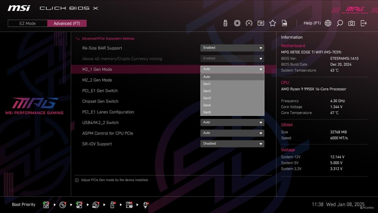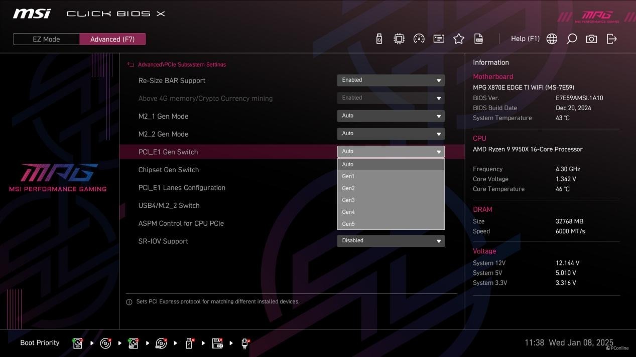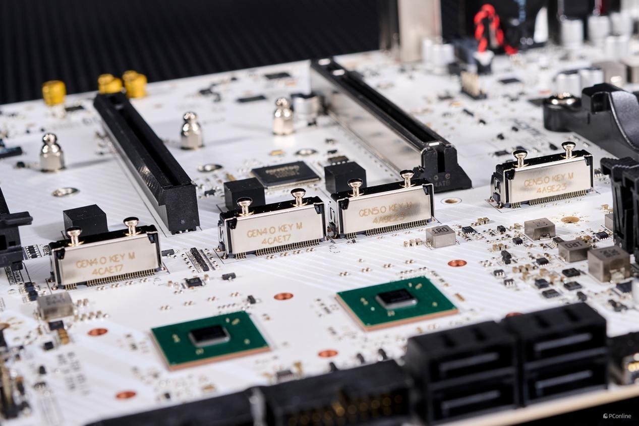 M.2_1与M.2_2固态硬盘、PCI_E1插槽运行模式可以单独进行调节控制,最高支持PCIe GEN5标准