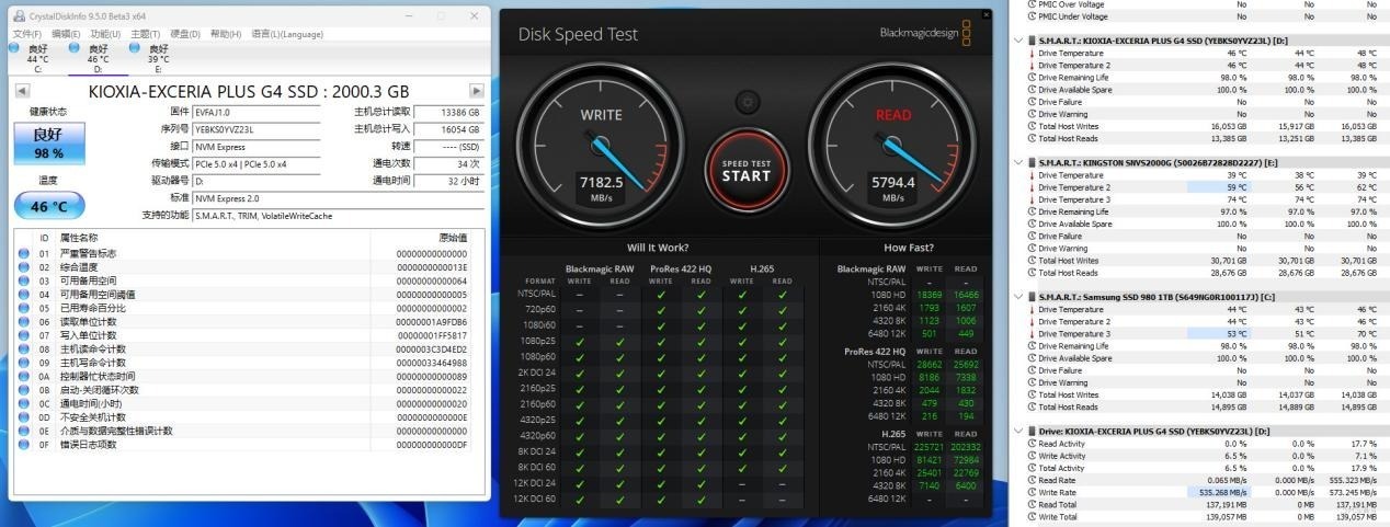 再来就是进行GEN5固态硬盘温度表现,利用Disk Speed Test进行10分钟的重复测试,被测试的GEN5固态硬盘温度为46度,且速度一直保持着较高的传输速率上限。利用IR热成像仪可观察到散热马甲的温度仅为31.4度,最高温度点反而是群联的PS7101传输芯片上。
