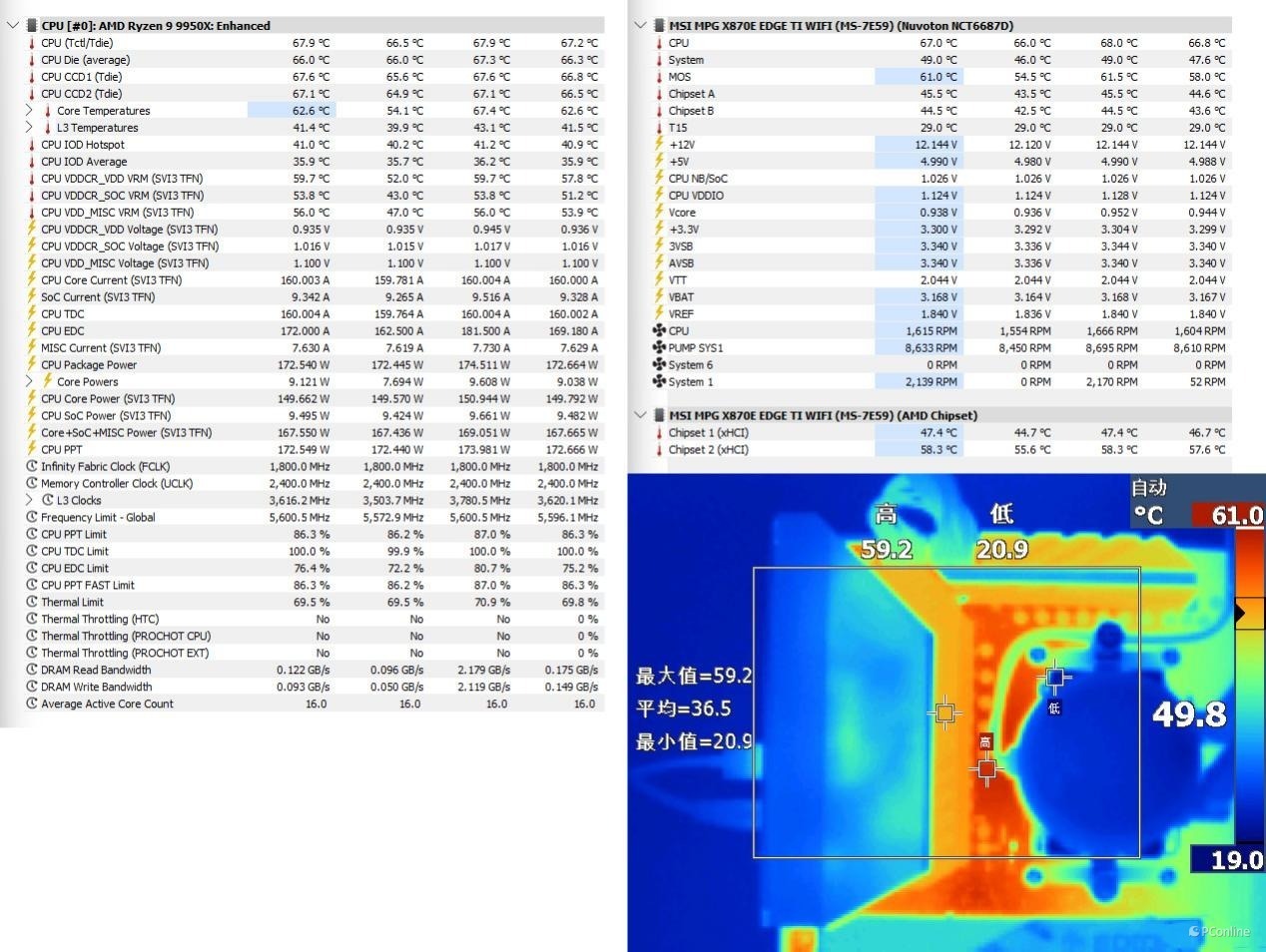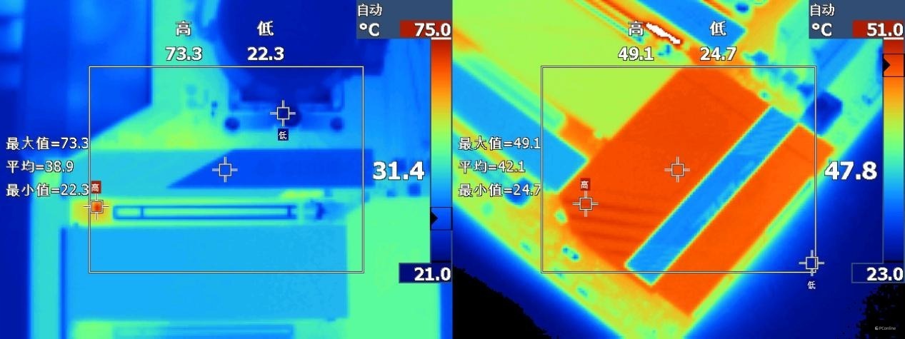 利用IR热成像仪可观察到主板PCB供电与处理器插座之间为最高温度点,为61度;而左侧主散热马甲表面温度仅为49.8度,顶部的次散热马甲温度要更低一些,可以说这样的温度表现是真让人满意。