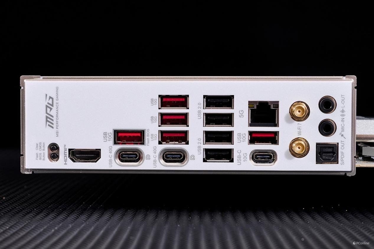 后置I/0挡板这里放到最后进行介绍,从左往右分别为:Flash BlOS Button、Clear CMOS Button、1*HDMI 2.1(8k60Hz)、2个USB 40Gbps Type-C、5*USB 10Gbps Type-A(红色)、4*USB 2.0 Type-A(黑色)、1*USB 10Gbps Type-C、5G有线网络接口、EZ WIFI7天线,以及音频输出接口。