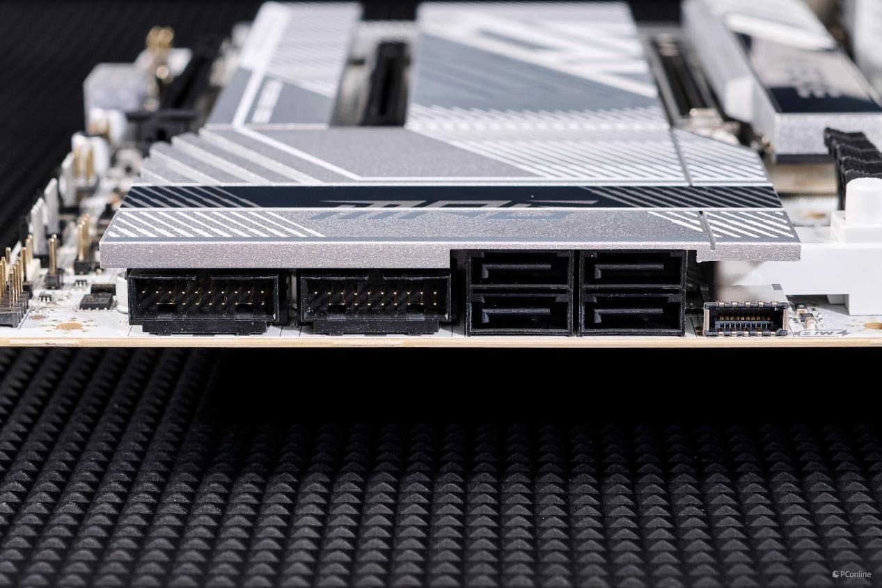 扩展接口较为丰富,从左往右分别为:2组前置USB-A 3.0接口(共4个)、4个SATAIII接口,以及带27W PD快充的前置USB-C接口。