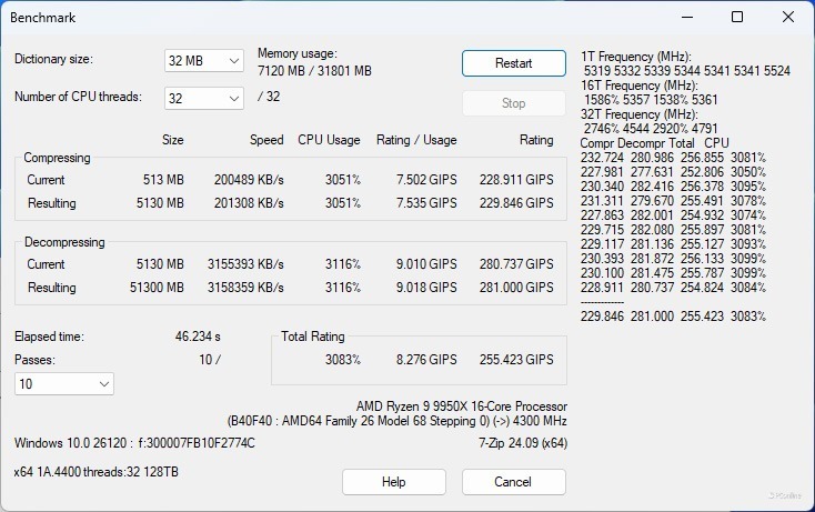 在内存性能发挥最佳的情况下,我们来进行下面的所有测试。7ZIP软件内置的测试程序来看,R9-9950X处理器性能发挥已经相当好,其压缩能力为229.846 GIPS,解压能力为281 GIPS。