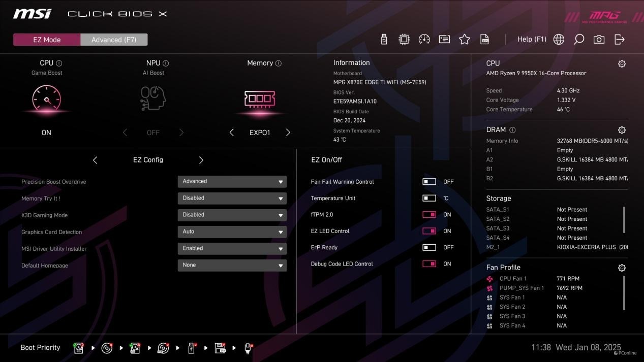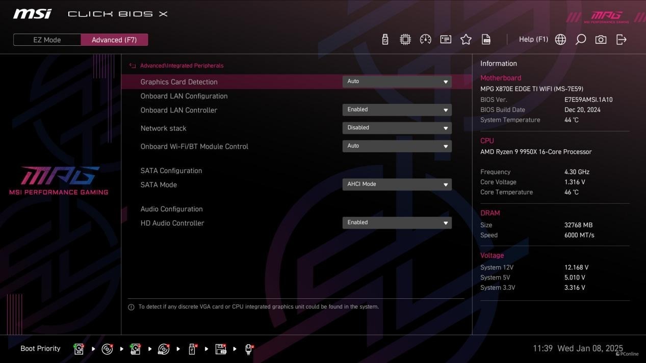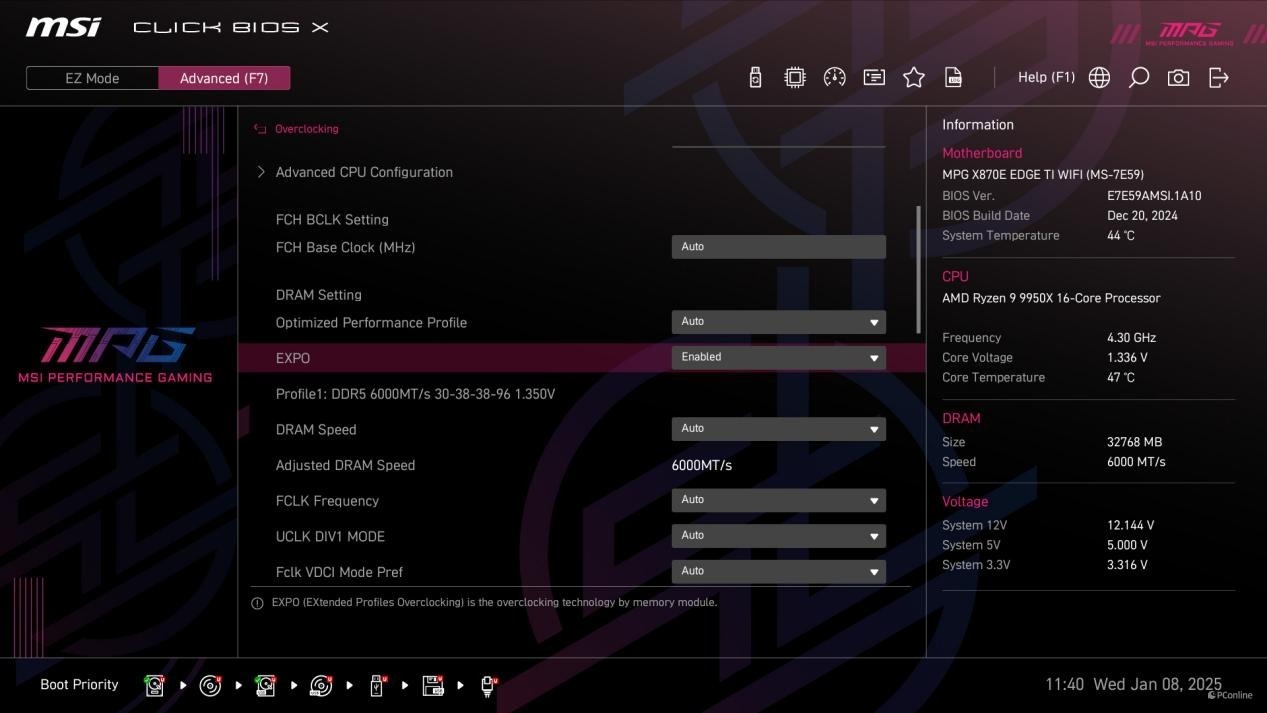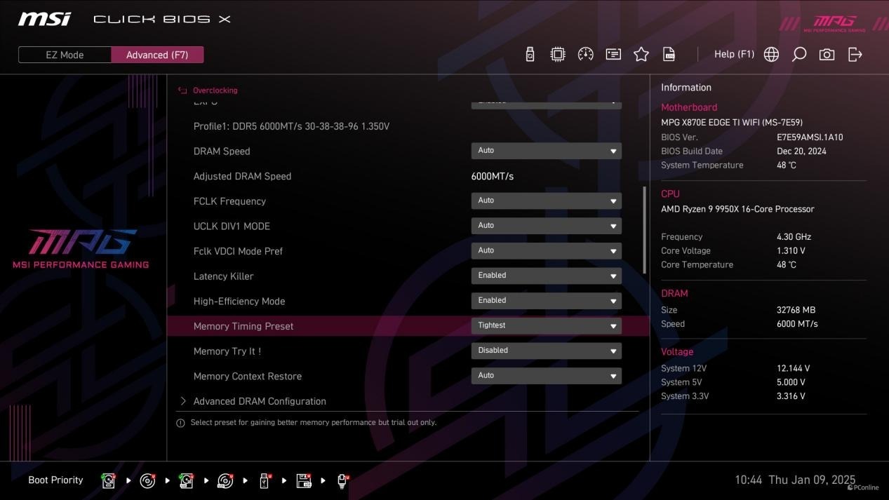 与其他新一代的MPG系列主板一样,MPG X870E EDGE TI WIFI刀锋钛主板采用了最新的UEFI BIOS界面,我们可以简单地对处理器、内存,以及其他硬件进行调节与监控。