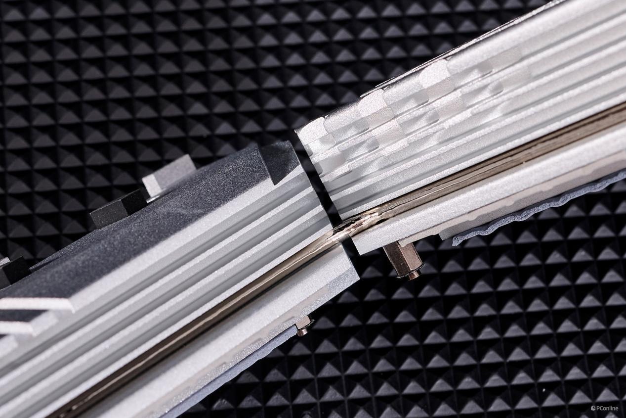 遮盖下面是两块大面积的扩散型散热模块,两块散热模块之前还利用热管进行辅助散热。