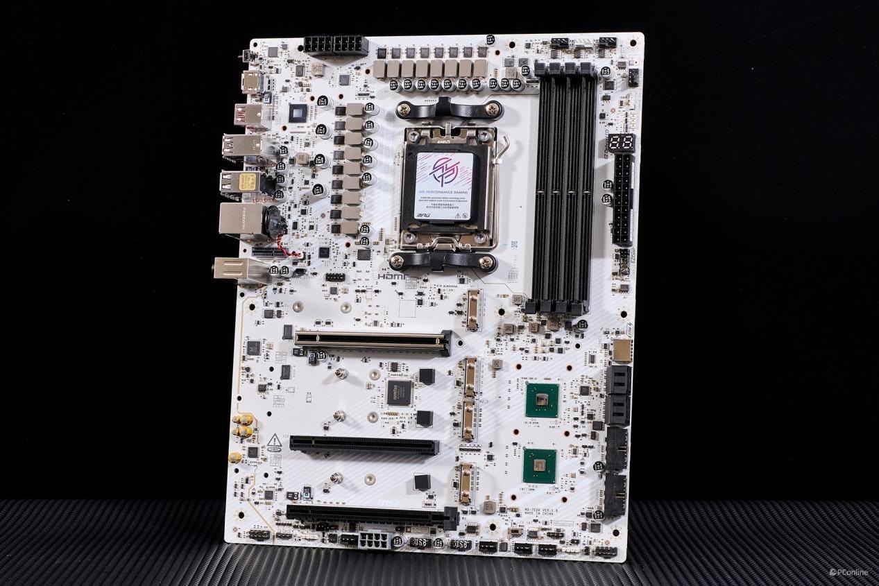 微星MPG X870E EDGE TI WIFI刀锋钛主板裸板,遵循ATX标准尺寸设计,尽管其白色外观可能给人一种较为稀疏的视觉感受,实际上,整块PCB布满了密集的电子元件。采用8层服务器级别的PCB和2oz铜料的构造,不仅提升了主板的电气性能,还确保了电流的稳定性,以及信号传输的迅捷性。