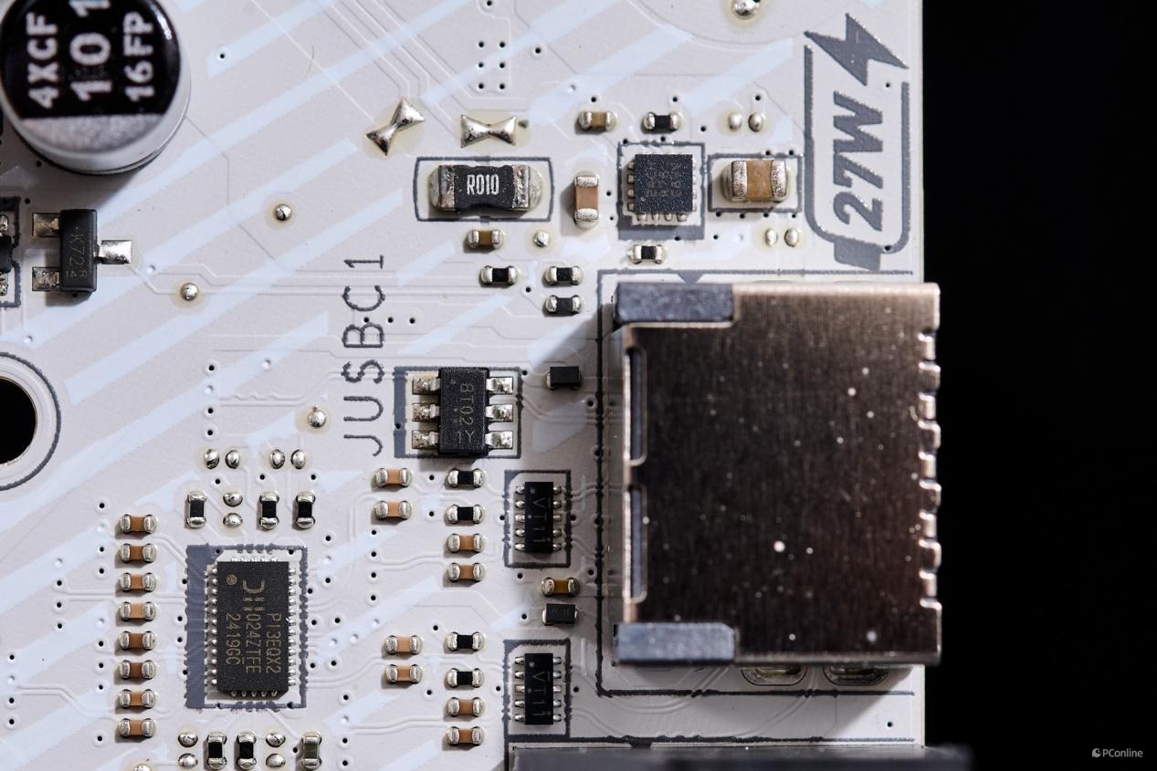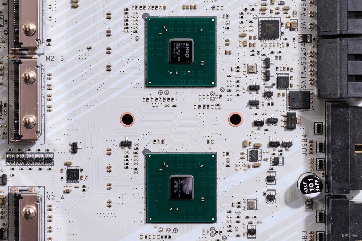 后置两个USB4高速传输则是由ASMEDIA ASM4242芯片提供,上行带宽更是高达PCIe 4.0 x4 64Gbps。因此若想实现USB4的满血高速传输时,M.2_2接口将会被受限,之后BIOS介绍时将会进一步讲解。