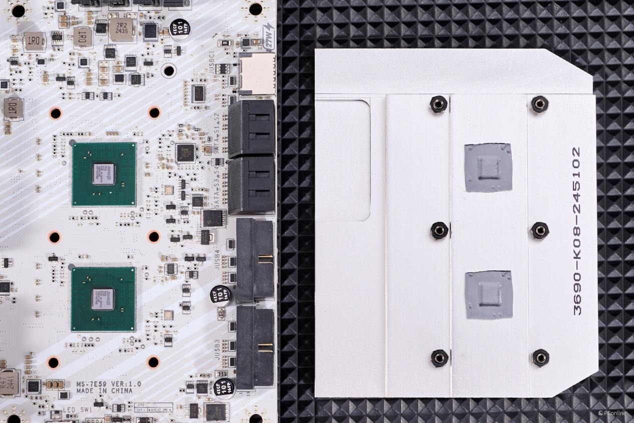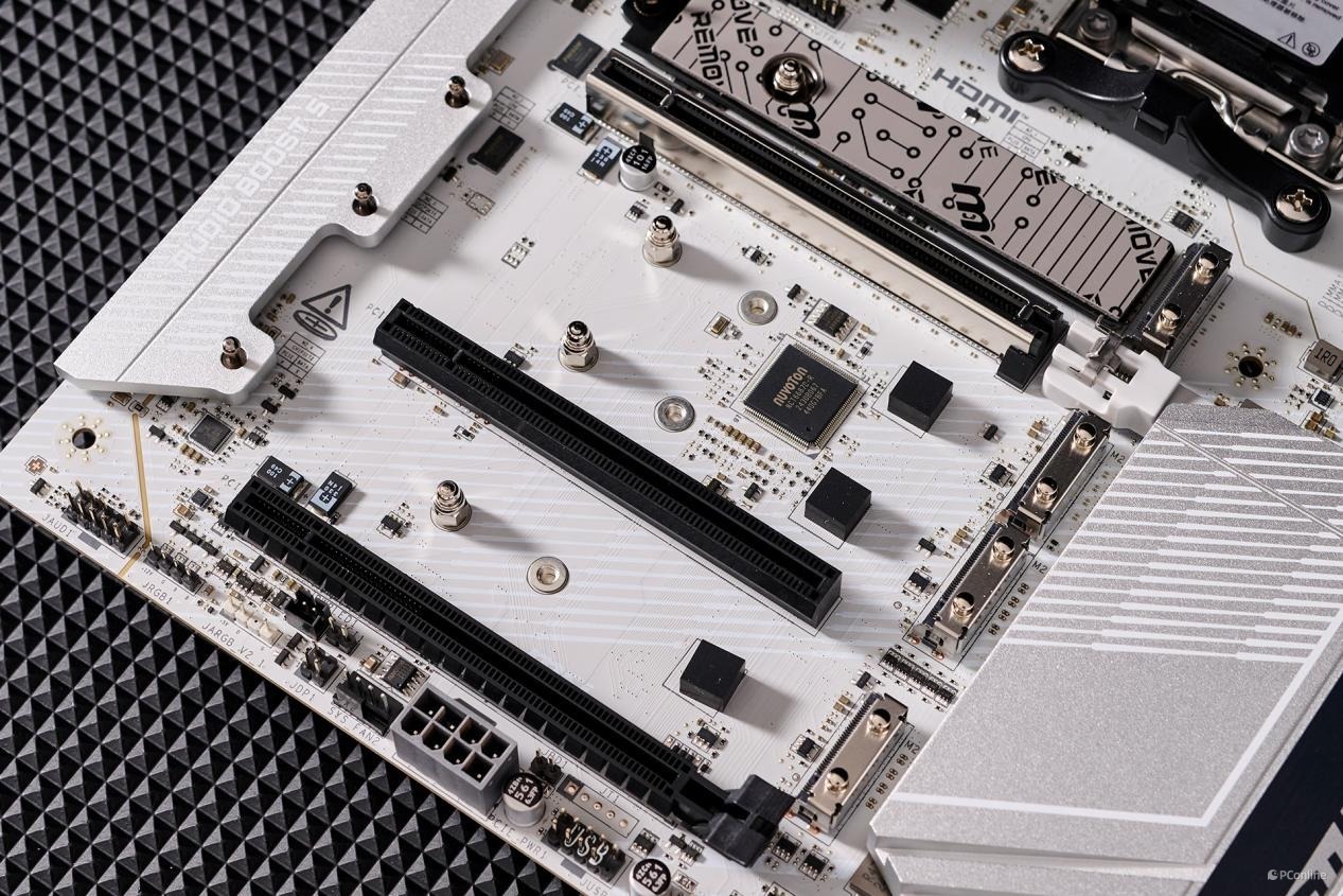 主板为X870E双芯片配备上了PCH散热马甲,设计同样宽大且厚实,一体化的设计巧妙地将扩展接口全部覆盖。