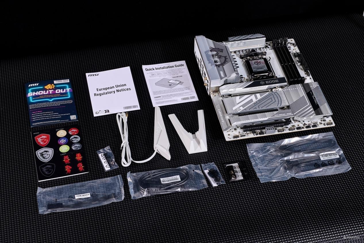 主板配件包里也是相当的丰富:快速安装手册、Eur环保说明书、产品注册手册、微星信仰贴纸、驱动U盘、M.2安装螺丝、内六角拆装锁匙、两条SATA线、前置面板IO延长线、EZConn转换线,以及EZ WIFI7天线等。