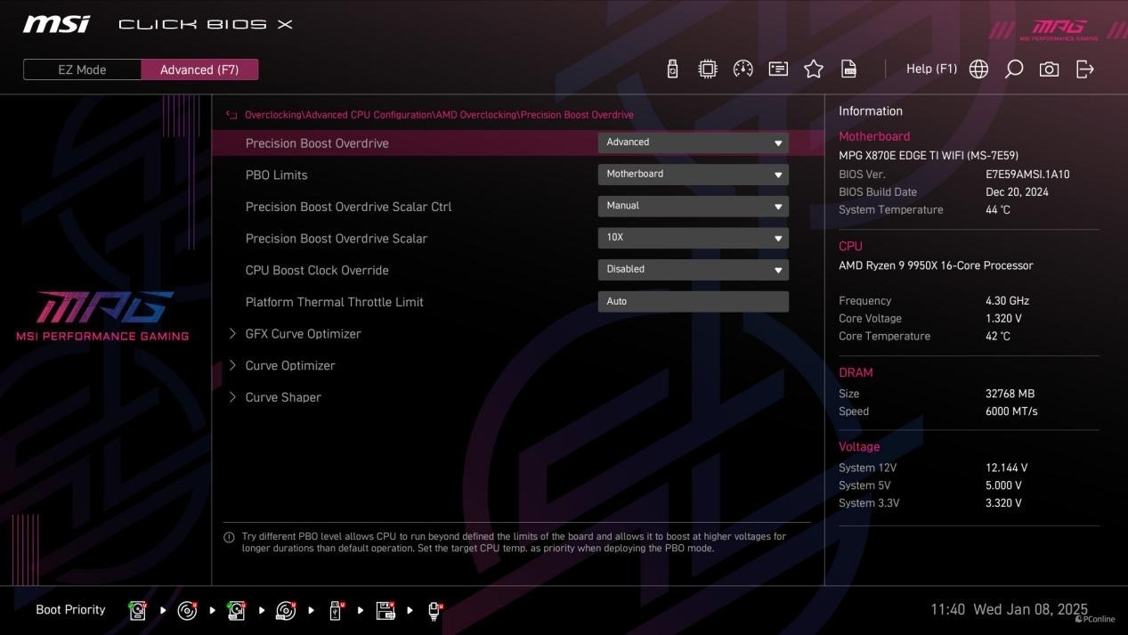 最后是玩家们最爱了PBO选项,我们可以选择不同的PBO控制档,以获得更好的处理器性能,当然前提也是处理器体质必须足够可以,要不然调节PBO级别太高,会出现系统不稳定等异常问题。