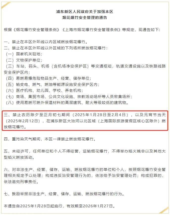 通告称,禁止农历除夕至正月初七期间(2025年1月28日至2月4日),以及元宵节当天(2025年2月12日),在浦东新区大治河以北区域(上海国际旅游度假区核心区除外)燃放烟花爆竹。