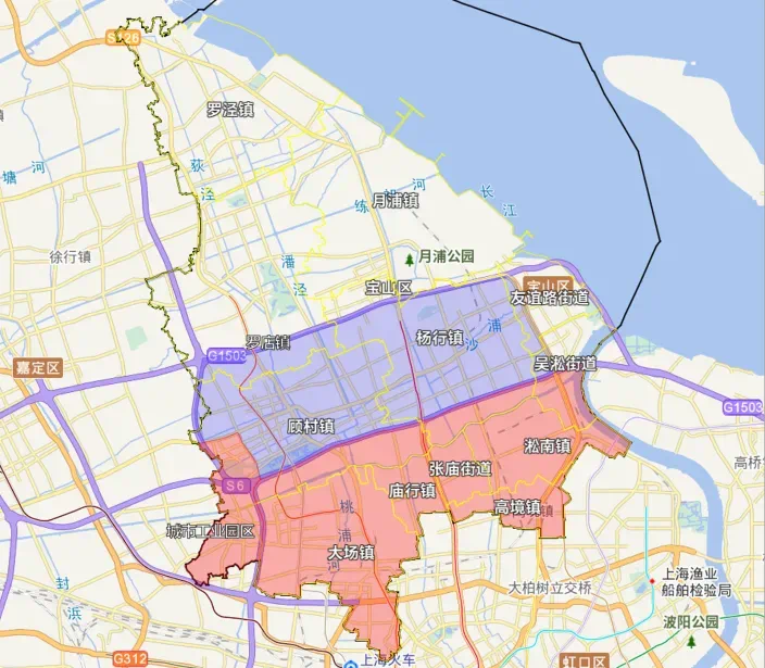 宝山区烟花爆竹禁止燃放区:红色区域为外环线以内和机场禁放区;蓝色区域为2025年1月28日至2月2日以及2月12日禁放区。 “上海宝山”微信公众号 图