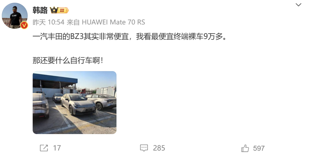 1月20日,汽车博主“韩路”在微博发文称,一汽丰田bZ3其实非常便宜,最便宜的终端裸车只需9万多。其还感慨表示,“还要什么自行车。”