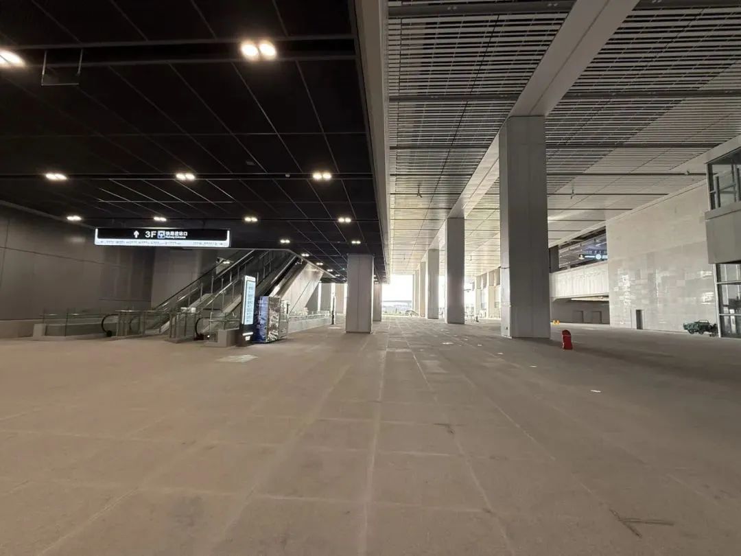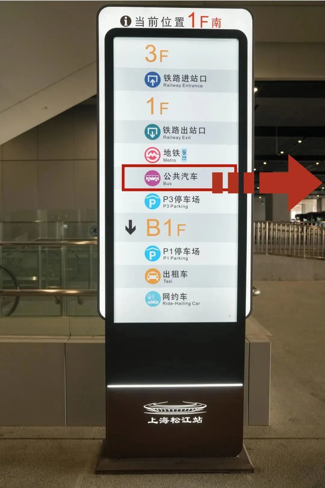 旅客从南区出站后,沿着通道步行,穿过门往左转,往前走,即可看到位于右前方的公交枢纽。
