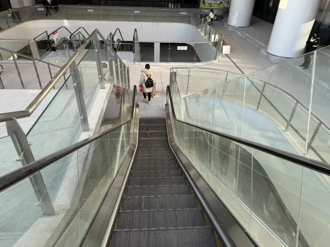 旅客从南区出站后,沿着通道步行,穿过门往左转,向前步行至扶梯口。