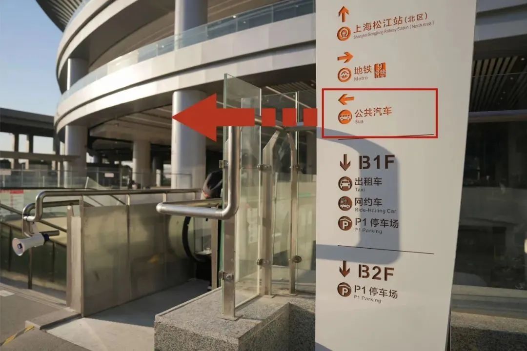 换乘公交的旅客从北区出站后,向右转,往前走,即可看到位于扶梯左侧的公交枢纽。