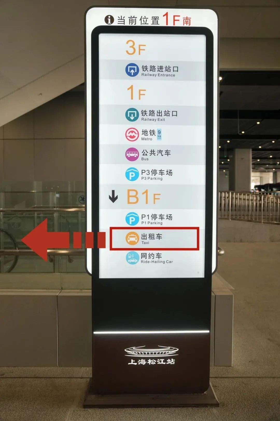 步入服务中心后,根据服务台屏幕上的标识向左转,往前从东1门走出服务中心,即可看到地铁上海松江站站的出入口。