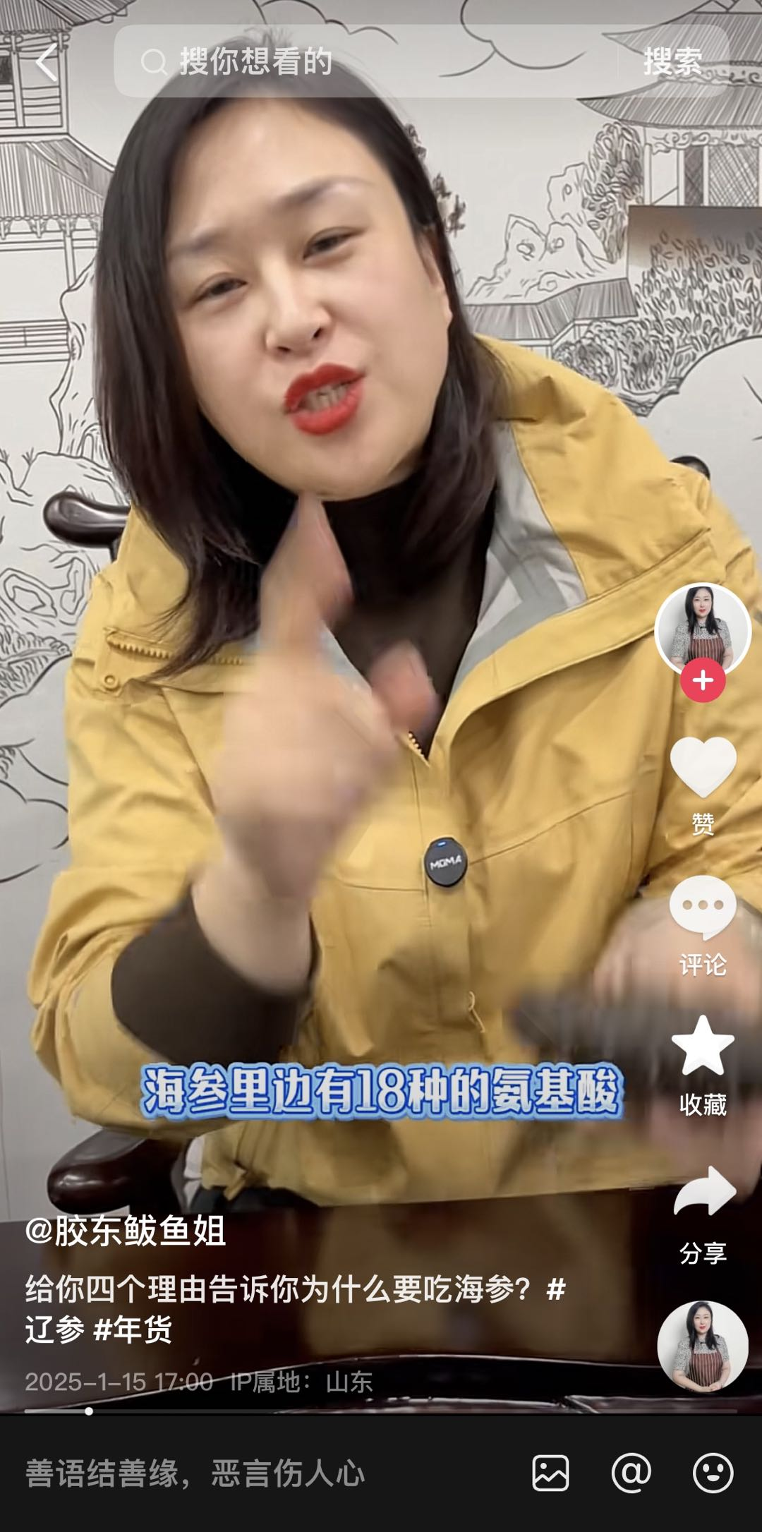 这次,她选择了同样不被看好的海参。但此时她已经不像上次“白手起家”时那样被动,而是背靠卖鲅鱼馅攒下的40万粉丝和全五星口碑的“人和”。烟台地处渤海湾沿岸,拥有适宜海参生长的优良水质和气候条件,以及成熟的海参加工产业链,为她提供了“地利”。