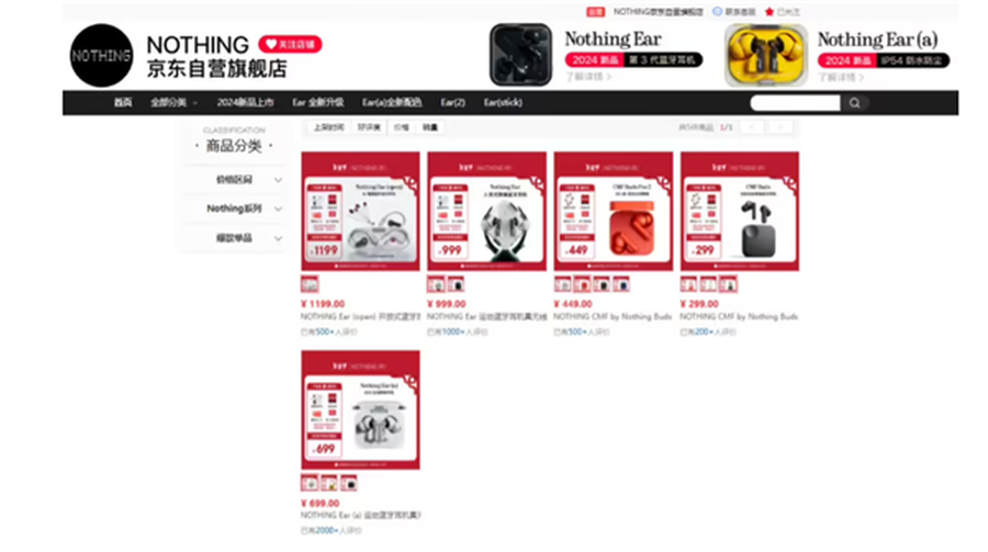 目前,京东已经设立了Nothing自营旗舰店,主要面向中国大陆消费者提供Nothing系列的耳机产品。这些产品包括Nothing Ear (open)、Nothing Ear入耳式降噪蓝牙耳机、CMF Buds Pro 2、CMF Buds以及Nothing Ear (a)在内的五款音频设备。