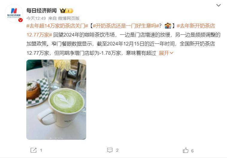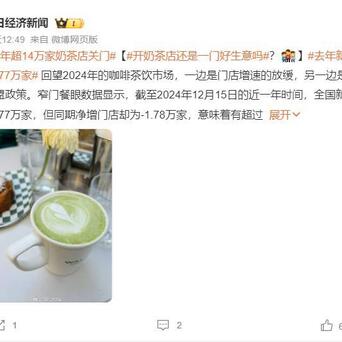 #奶茶店#窄门餐眼数据显示,截至2024年12月15日的近一年时间,全国新开奶茶店12.77万家,但同期净增门店却为-1.78万家,意味着有超过14万家奶茶店选择了关门。