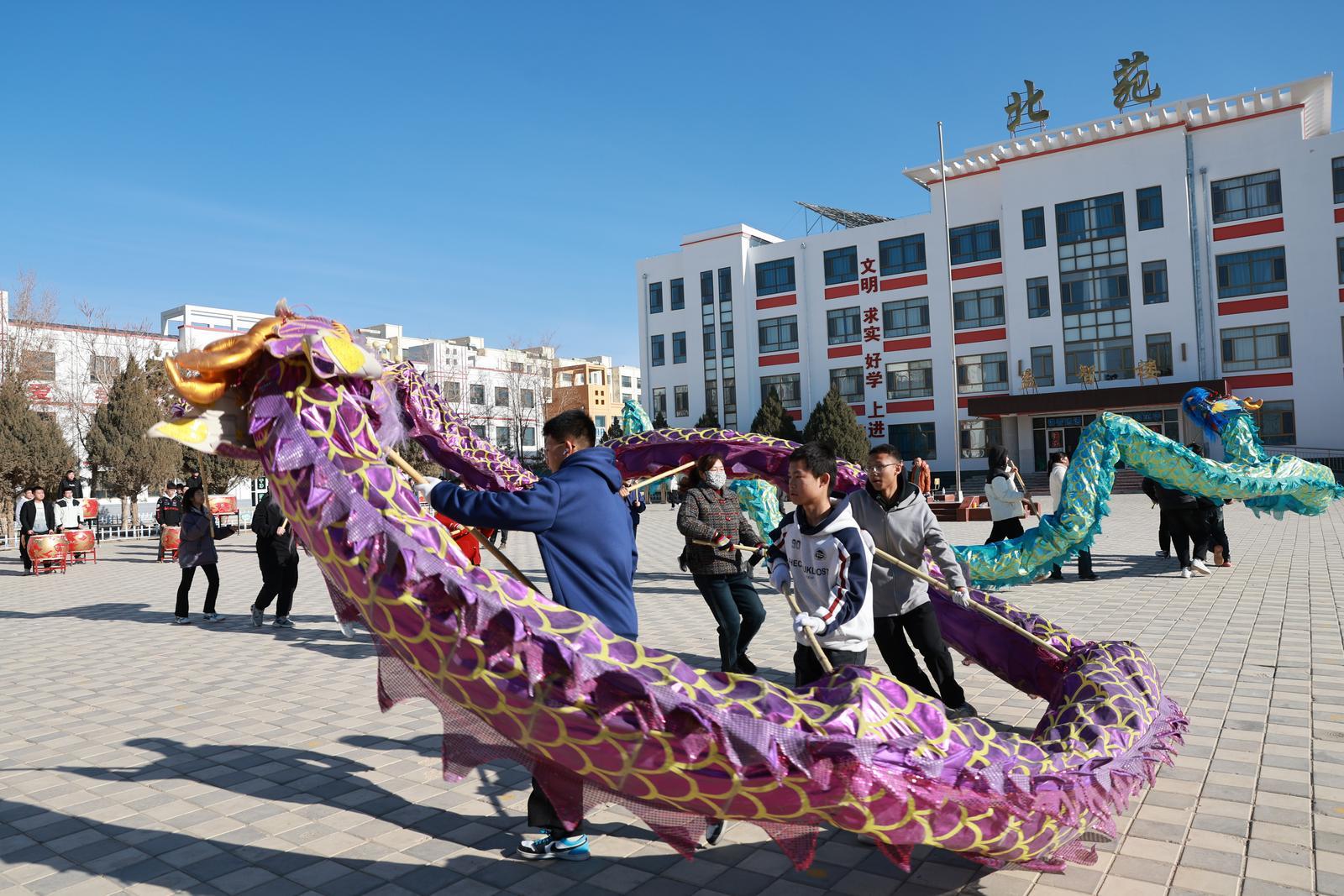 尽管天气非常寒冷,但在金塔县金塔镇,演员们却个个生龙活虎、精神抖擞,紧张地排练着威风锣鼓和舞龙排练,伴随着铿锵的鼓点,“金龙”翻滚,演员们时而整齐划一,时而变换队形,呈现出一派喜庆热闹的景象。