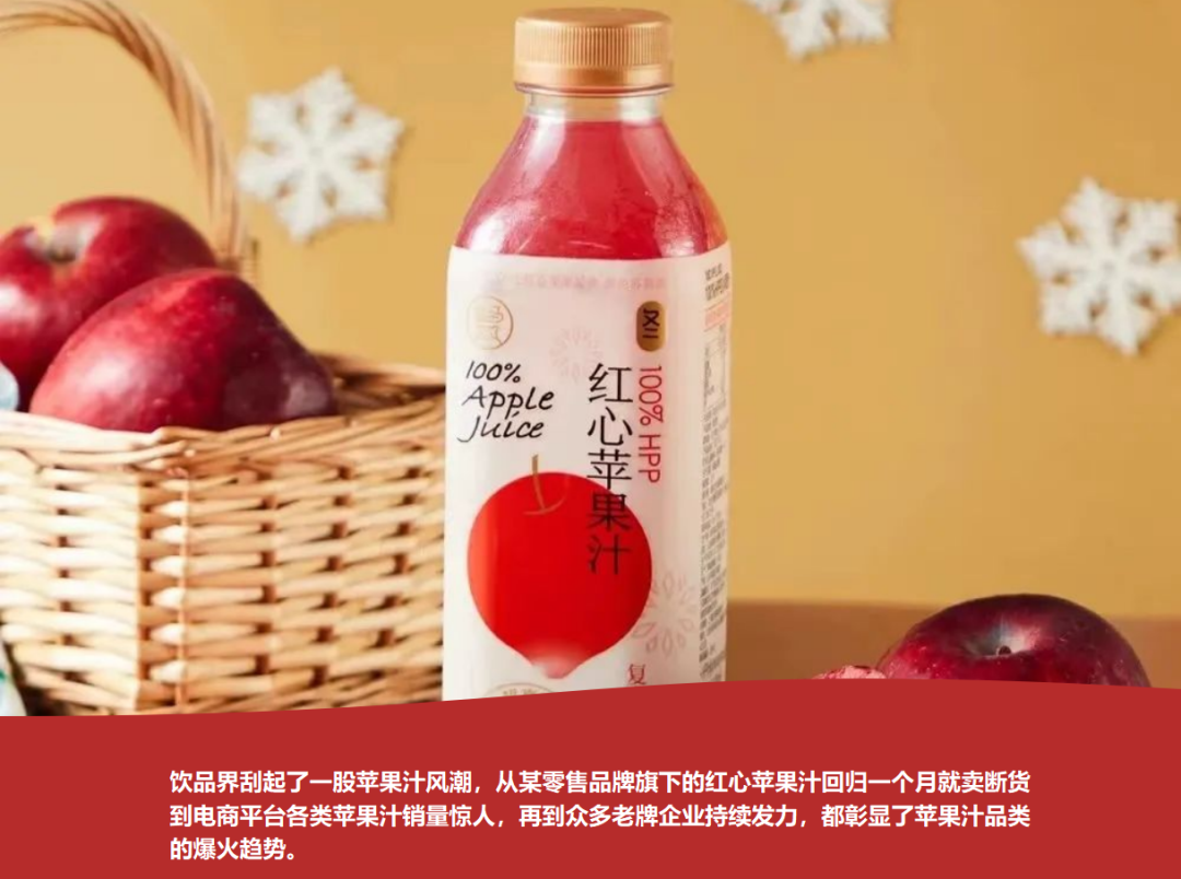 近段时间,饮品界刮起了一股苹果汁风潮,从某零售品牌旗下的红心苹果汁回归一个月就卖断货到电商平台各类苹果汁销量惊人,再到众多老牌企业持续发力,都彰显了苹果汁品类的爆火趋势。但从产品价格来看似乎并不符合消费降级的大趋势,这主要与产品本身高原料、工艺所带来的附加值有关,既具备高品质的产品特点,又兼具健康属性,使其市场中脱颖而出。