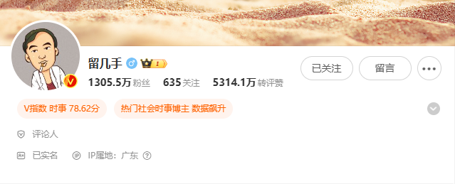 在《再见爱人4》中,留几手可以说是微博的绝对头部,其微博账号以“毒舌点评”走红,早期通过对网友自拍照进行辛辣、犀利甚至有些刻薄的点评吸引大量关注,积累了庞大粉丝群体。从当下数据来看,留几手微博粉丝量为1305万。