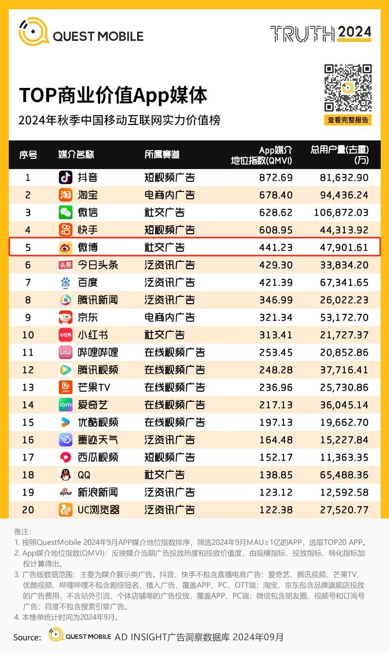 毫无疑问,微博仍然是这个时代最重要的社交媒体之一。根据数据显示,微博月活用户5.87亿,日活用户2.57亿。这一数字并不算低,在QuestMobile近期发布了2024年中国移动互联网秋季大报告中,微博排行,TOP50赛道用户规模第15名,在top商业价值媒体中排行第五。