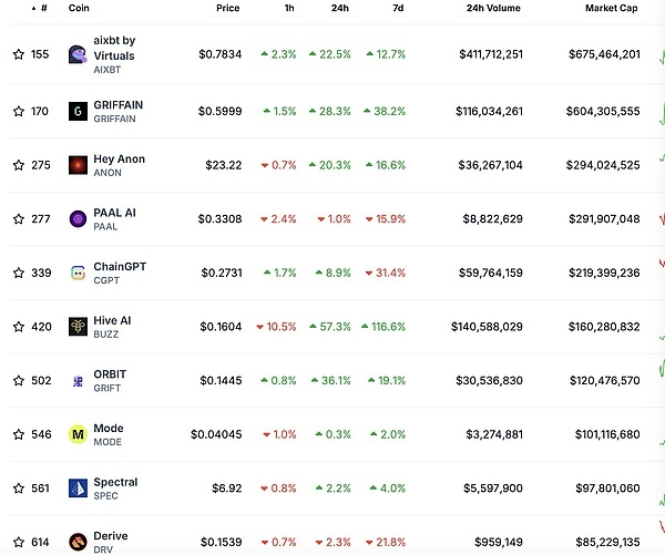 根据CoinGecko数据显示,当下该赛道的整体市值为33亿美元左右,24小时上涨超11%。目前市值排名前十的项目分别是aixbt、GRIFFAIN、Hey Anon、PAAL AI、ChainGPT、Hive AI、ORBIT、Mode、Spectral、Derive。
