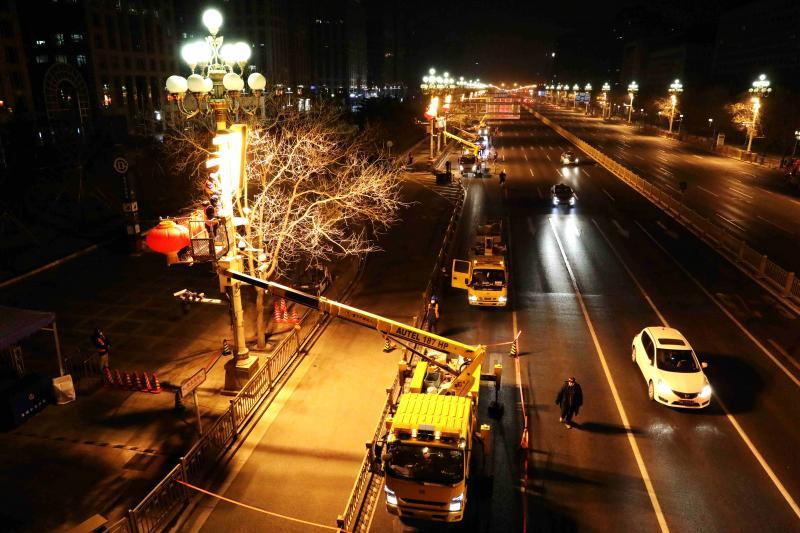 小年夜当晚,长安街上,国网北京电力城市照明管理中心春节景观布置保障团队正在对灯笼灯饰进行24小时特检特巡。