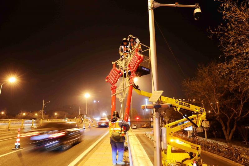经过前期的“体检”、安装、调试和试运行,长安街华灯上的242套大红灯笼、东西延长线单弧路灯上的862套中国结和北海大桥地区的100套串灯于小年夜正式进入“春节模式”,长安街“披红”迎新春。