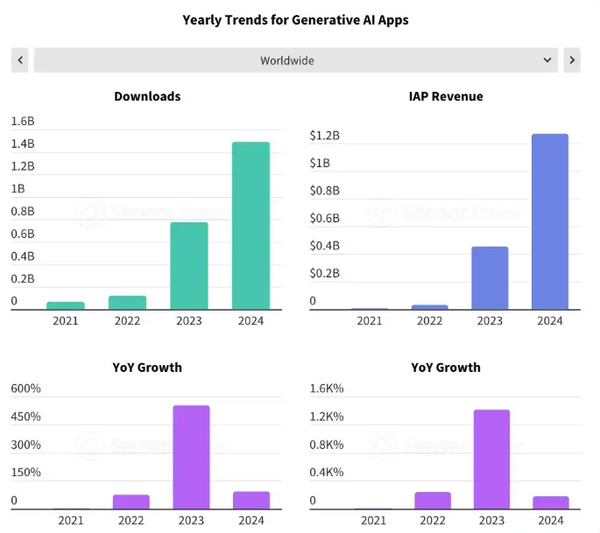 此外,AI技术正广泛融入各类应用中。据统计,2024年在iOS和谷歌Play应用商店中,名称、副标题或简介中包含“AI”字样的应用被下载了170亿次。由于未涵盖众多第三方应用市场,实际下载量可能更高。