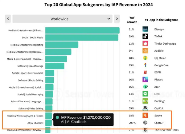 作为对比,2024年全球应用内购消费最高的非游戏应用类别中,电影与电视剧流媒体平台(以迪士尼+为代表)位居榜首,达到119.8亿美元,而社交媒体应用(以TikTok为代表)紧随其后,达到117.59亿美元。
