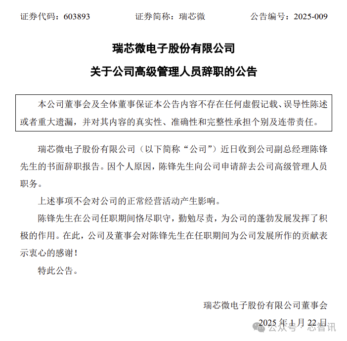 1月22日晚间,国产物联网(IoT)及人工智能物联网(AIoT)处理器芯片厂商瑞芯微发布公告称,近日收到公司副总经理陈锋先生的书面辞职报告。因个人原因,陈锋先生向公司申请辞去公司高级管理人员职务。
