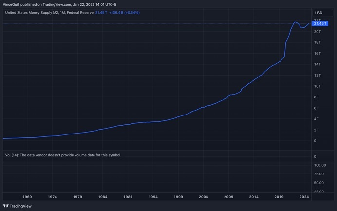 (1969-2024年衡量美元流通总量的M2货币供应量走势图 来源:TradingView)
