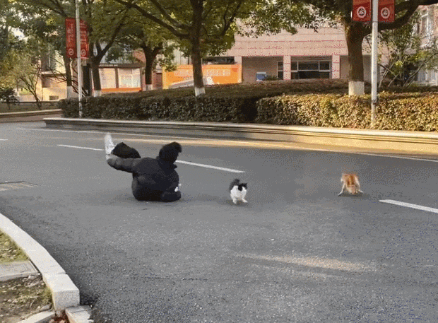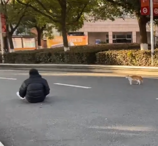 万万没想到,下一秒奶牛猫就创上了路中间走路的男生!