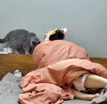 不得不说,小猫咪还怪好心的哈,还刚好给铲屎官脑袋上戴了朵花花嘞~
