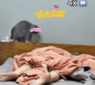 于是福福成功跳上了床头柜,目标是玻璃花瓶里的花or水。