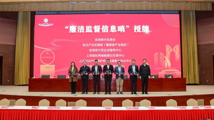 大会上,市纪委监委第五监督检查室副主任黄伟同志受邀出席,为临港新片区商会、前沿产业区南区(重装备产业园区)、临港新片区企业服务中心、上海国际再保险登记交易中心、上海知识产权保护中心临港新片区分中心、临港新片区数据跨境服务中心等新一批6个“廉洁监督信息哨”授牌,在实现区域覆盖的基础上按领域拓展更多的“监督探头”,助力临港新片区成为“近悦远来”的投资兴业新高地。