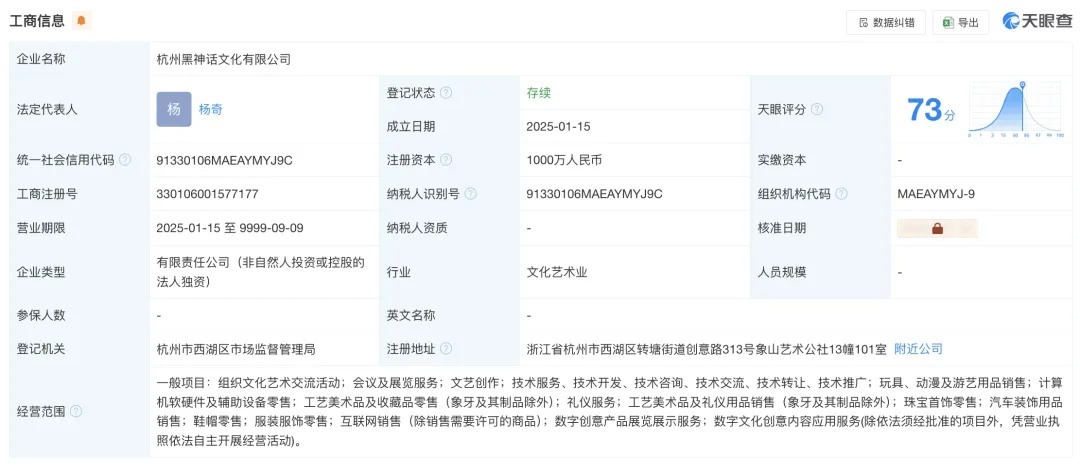杭州黑神话文化有限公司的主要人员有杨奇和《黑神话:悟空》联合创始人余冉星,由杭州游科互动科技有限公司100%控股。