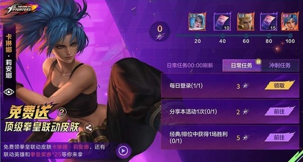 除了已经上线的各种英雄和皮肤免费送,《决胜巅峰》还与重磅IP联名。1月23日-3月10日,完成任务领取积分解锁进度奖励,免费领取SNK联动皮肤[莉安娜]、永久英雄[卡琳娜]&[周]等丰厚奖励。