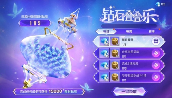 1月23日-4月27日,完成任务免费领取限时钻石、战场点,最多可得15000限时钻石,是一个攒钻石不错的方式。从时间来看,基本确定S1赛季到4月底就结束了,所以也是一年4个赛季,大家可以在有效期内把钻石花出去。前边提到的排位工资,也会在5月份给到大家的账户上,每人能分到多少这个悬念值得期待。而且到S1赛季结束,累计消费钻石达到5000,就可以领取国服限定皮肤——路西法·罗刹鬼刃。