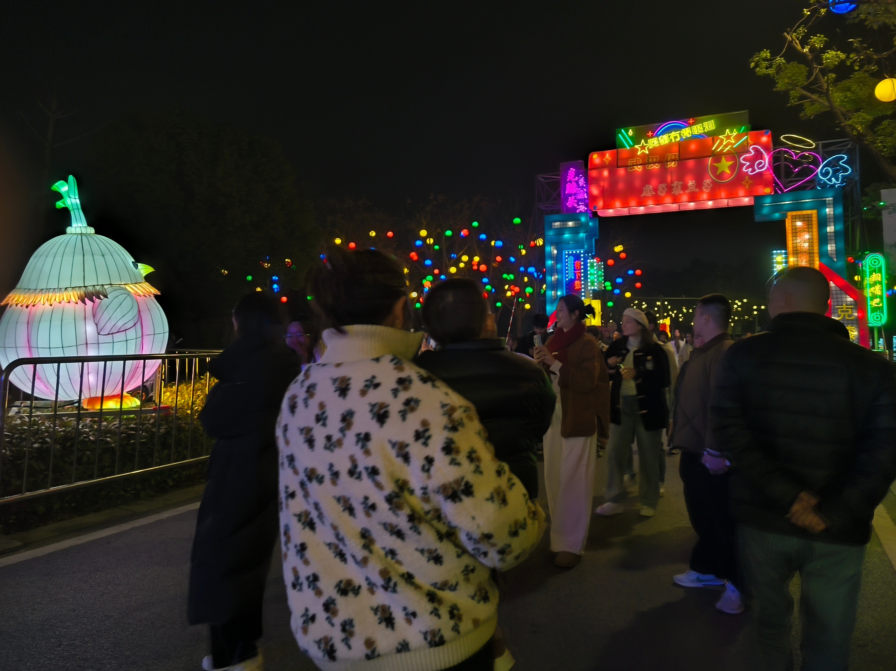 当晚,九派新闻记者在景区看到,进园的游客排长队,园内众多游客在自己喜欢的灯组前打卡拍照。2米高的“蒜鸟”配着武汉话音效,吸引不少游客的目光。