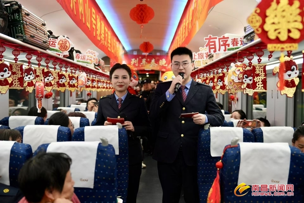 南昌新闻网讯 1月22日晚,在南昌开往北京丰台的D136次“井冈山号”高铁上,2025年列车春晚如约而至,精彩节目获得了乘客们阵阵掌声。 据了解,今年的列车春晚“上新”了不少“非遗”节目。车厢成了舞台,满载欢声笑语一路前行;乘客皆为观众,传承传统文化,编织一段难忘的温馨旅途。(杨铭鸣 洪观新闻 记者 马悦 文/图)