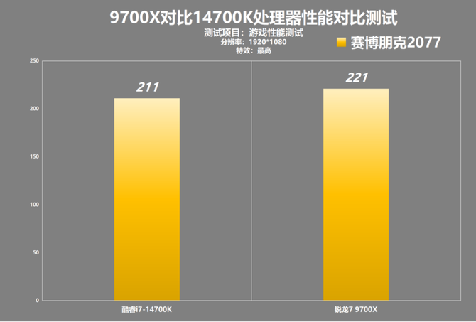 来到3A游戏上,我们直接起手就是硬件杀手级别的《赛博朋克2077》,这款游戏目前经过数次的优化之后,游戏表现已经非常出色,这款游戏的测试中我们可以看到,AMD锐龙7 9700X的游戏帧数为221,酷睿i7-14700K的游戏帧数为211,9700X的游戏帧数领先5%左右。