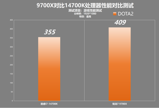 DOTA2这这类非常吃CPU性能的网络游戏,CPU的性能直接影响游戏性能的帧数,在1080P分辨率下,AMD锐龙7 9700X的游戏帧数达到了409,领先14700K约为15.2%,领先非常明显。
