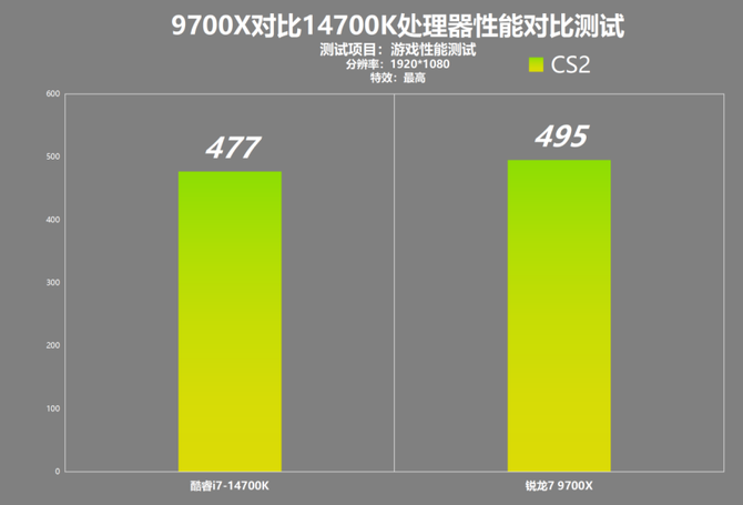 经过我们的实际测试,9700X的游戏帧数达到495,酷睿i7-14700K的游戏帧数为477,帧数领先。