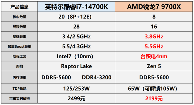 要说目前的中高端处理器上,单纯地讲游戏性能的话,市面上可选的就是AMD锐龙7 9700X和英特尔酷睿i7-14700K,虽然很想说买新不买旧,但是新的酷睿Ultra游戏性能实在是不如上代,所以可选择的,真就只有上面两款了,下面是两款处理器的规格。