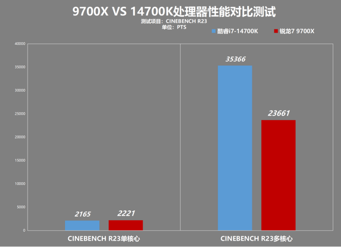 CINEBENCH R23是一款测试处理器性能常用的软件之一,在这个项目内我们可以看到,AMD锐龙7 9700X的单核心性能分数为2221,领先14700K,而在多核心方面的话,AMD锐龙7 9700X的核心数量少,则会明显落后14700K。