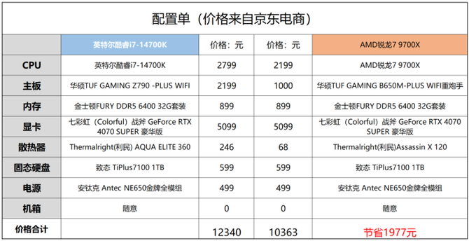 并且我们还准备了实时的京东配置单,从上面的配置来看的话,同样的配置的话,AMD和英特尔的两套平台的差价来到了近2000元,并且游戏性能表现上9700X还更好,这意味着选择AMD将会用更少的钱换更强的性能,如果预算相同,玩家还可以用省下的2000元给电脑显卡升个档,或者升级更大的内存和更大的硬盘容量,自主性非常强。