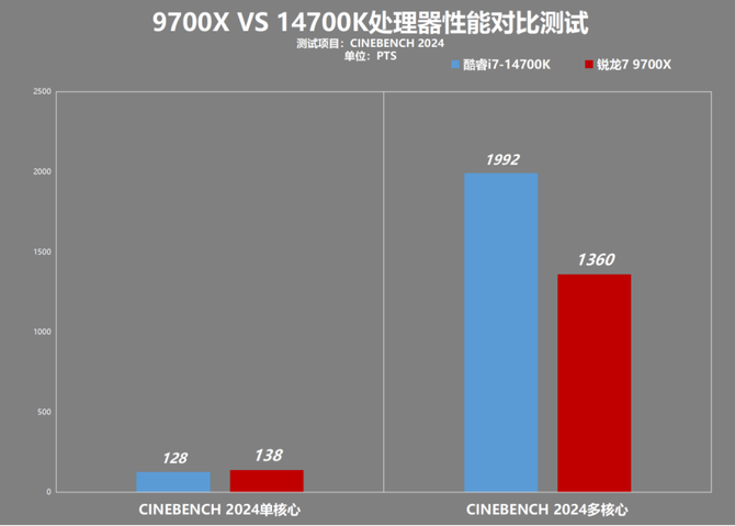 CINEBENCH 2024的测试中,AMD锐龙7 9700X的单核心成绩为138,明显领先英特尔酷睿i7-14700K,这里就是制程和高主频的优势就一目了然,但是遗憾只有8核心,在对比20核心的时候,落后是必然的情况。